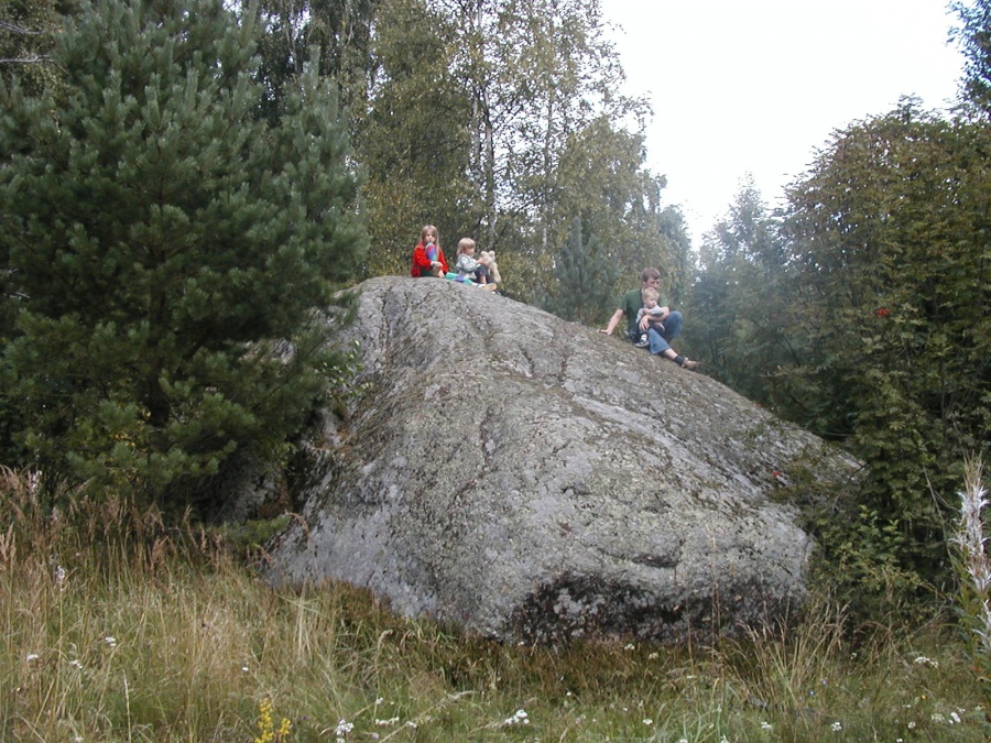 Царь-камень на острове Б. Березовый. Камень лежит в лесу, а не на берегу, что довольно необычно. На самом темечке камня в него загнан железный штырь. Вероятно, финны пытались его расколоть. Это у них такая забава- по острову много искусственно расколотых камней правильной формы