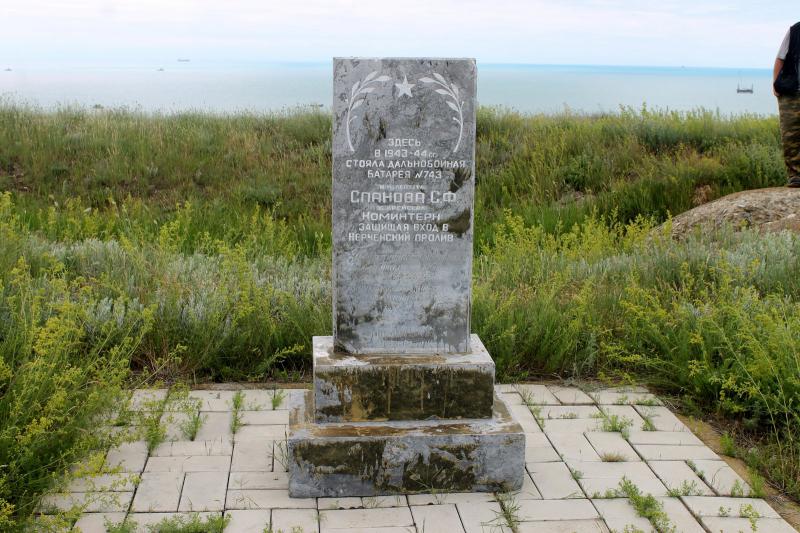"Здесь 1943-1944 годах стояла дальнобойная батарея № 743 капитана лейтенанта Спахова С. Ф. с крейсера Коминтерн. Защищая вход в Керченский пролив"."Судьба Крейсера "Коминтерн" с которого снимали орудия для этой батареи заслуживает отдельного внимания. Сначала он участвовал в съемках фильма Сергея Эйзенштейна в роли броненосца «Потемкин».В июле 1942 года во время массированного авианалета немецкой авиации крейсер получил прямое попадание бомбой, а еще через две недели, уже в другом порту во время очередного авианалета неразорвавшаяся авиабомба пробила корабль насквозь. В условиях отсутствия ремонтной базы, сильно поврежденный, устаревший и изношенный корабль было решено разоружить и затопить."