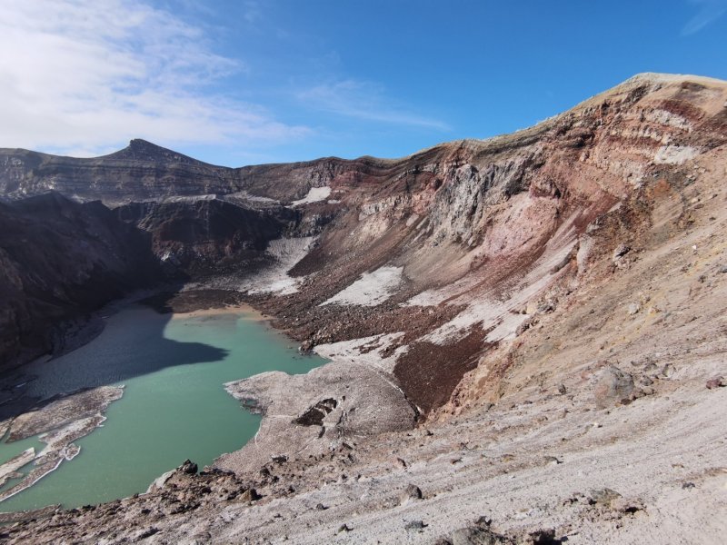 Вулкан Малый Семячик и кислотное озеро в его кратере.