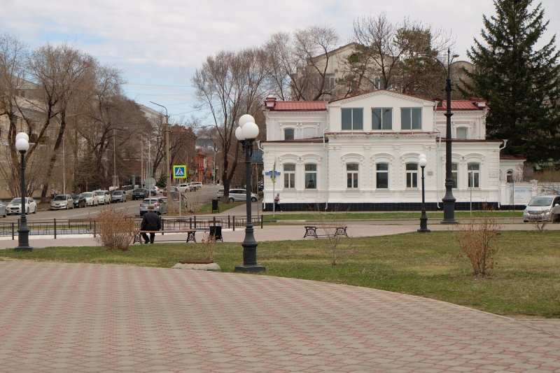 После Февральской революции Благовещенск стал центром украинского национального движения в Амурской области. Были созданы Союз переселенцев колонистов Амурщины и Амурская Областная Украинская Рада. После Октябрьской революции Городской совет депутатов возглавил большевик Фёдор Никанорович Мухин. В 1919 году в Благовещенск пришли японские оккупанты, которые прославились жестокими казнями: так, в ночь с 26 на 27 марта 1919 года были казнены 16 амурских комиссаров. В мае 1920 года амурские партизаны и войска Дальневосточной республики изгнали японцев с территории Амурской области. С 1920 по 1922 годы Амурская область входила в состав независимой Дальневосточной республики, затем вошла в состав СССР. Мечты дальневосточных украинцев о независимости от Москвы не были реализованы. Прогулку построим по времени с утра до вечера, хотя по факту это нарезка из двух половин разных дней. Вид на площадь Ленина из гостиницы «Юбилейная». Справа областная администрация.