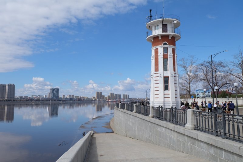 Парадная часть набережной Благовещенска заканчивается возле пограничной вышки.