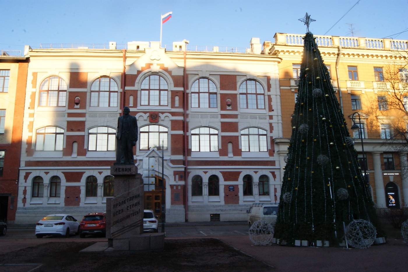 Владимир Ильич Ленин на фоне исторического здания бывшей школы и приюта лютеранской церкви Святой Екатерины.
